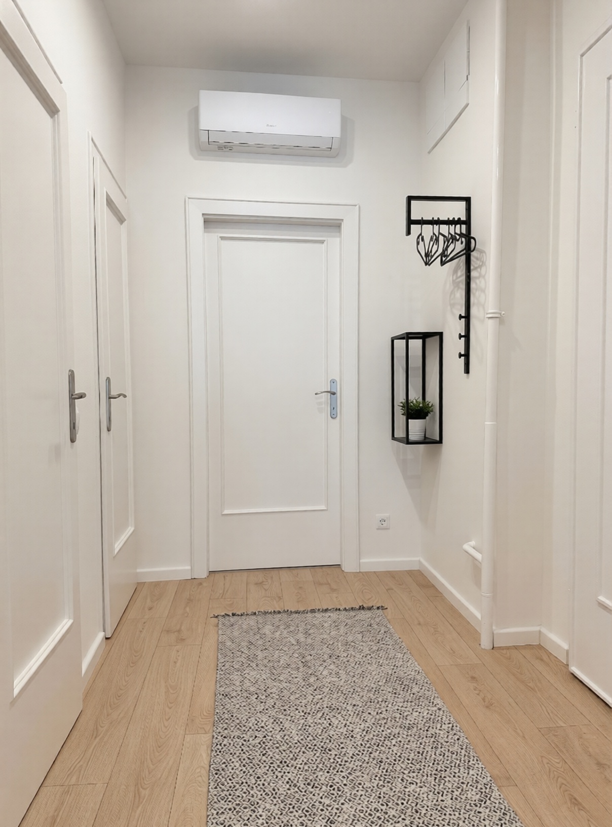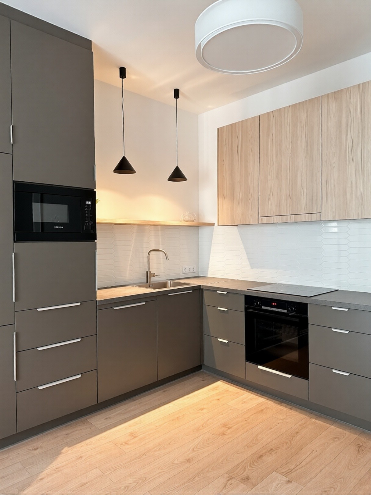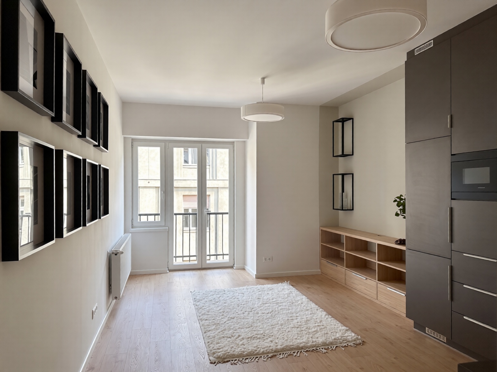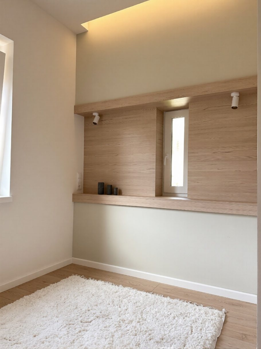 Die Renovierung begann mit dem Rückbau bis auf die rohen Wände, was eine vollständige Neukonzeption der Wohnung ermöglichte. Bei der Planung wurden die bestehenden Wände weitgehend beibehalten, dennoch wurden die Funktionen radikal verändert: Wohnzimmer und Küche wurden zu einem gemeinsamen Raum zusammengeführt, der eine offene, helle zentrale Zone schafft, die besser zum modernen Lebensstil passt. Anstelle der ursprünglichen Küche entstand ein großzügigeres Schlafzimmer, während aus dem vorher engen Schlafzimmer ein Ankleidezimmer wurde.