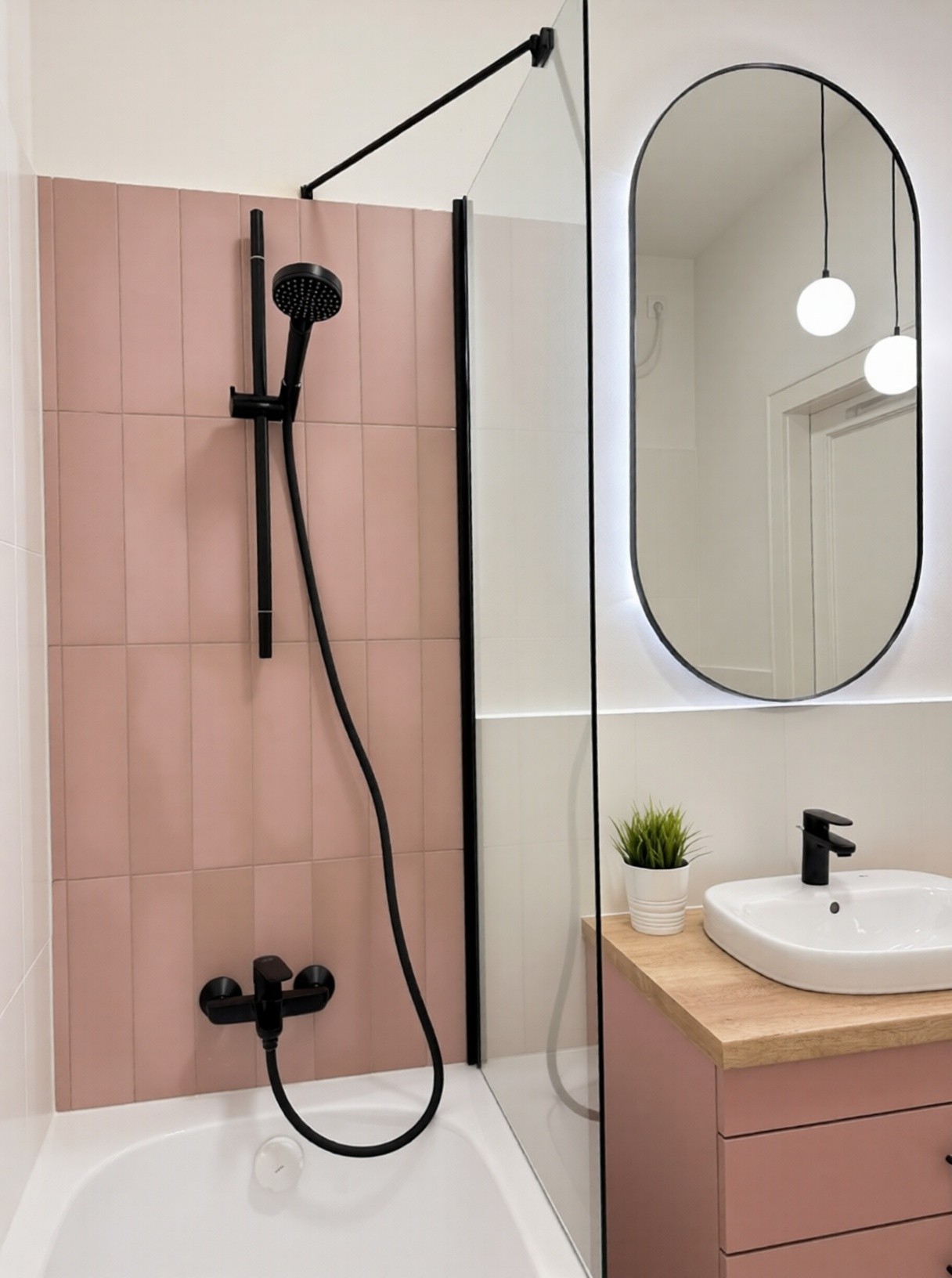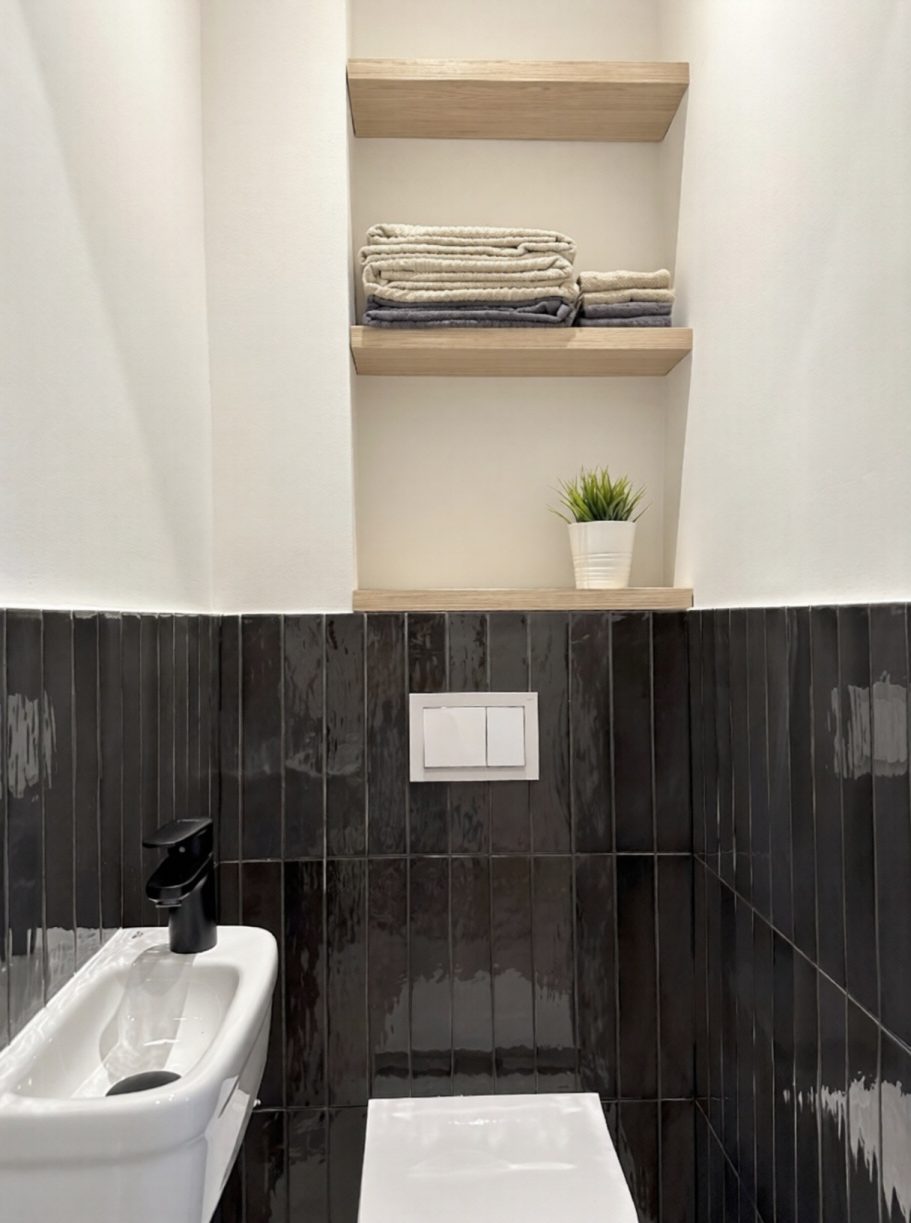 Diese neue Raumaufteilung erhöht den Nutzungskomfort erheblich, während die Wohnung trotz der kleinen Fläche deutlich geräumiger wirkt. Die Nassbereiche blieben an ihrer ursprünglichen Stelle, das Badezimmer erhielt jedoch eine funktional durchdachte, ergonomische Anordnung, die die tägliche Nutzung einfacher und komfortabler macht.