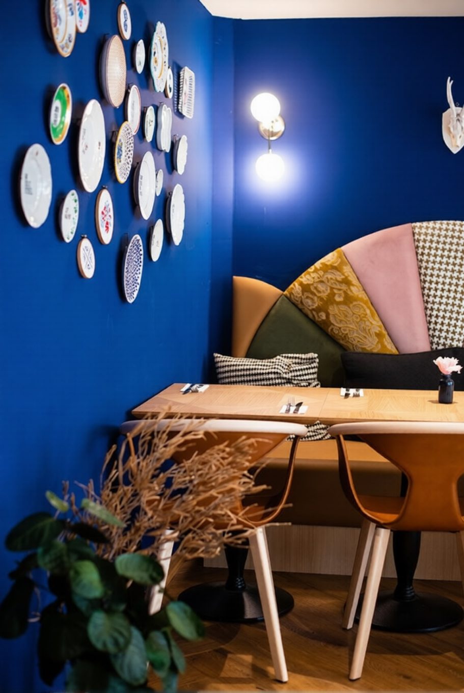 - Tiefe Blau- und Petroltöne setzen Akzente an ausgewählten Wand- und Möbelflächen und stärken die Markenidentität