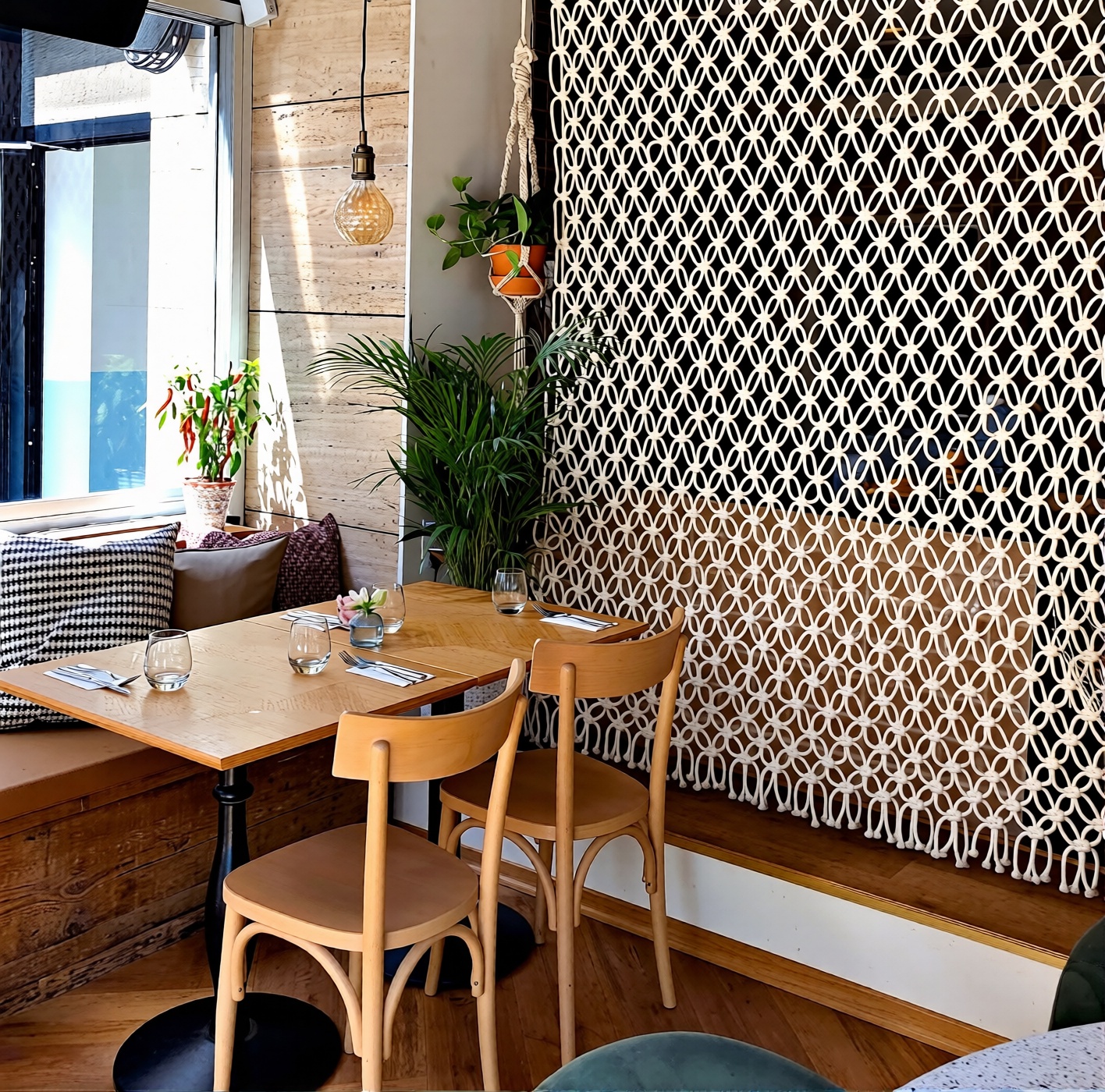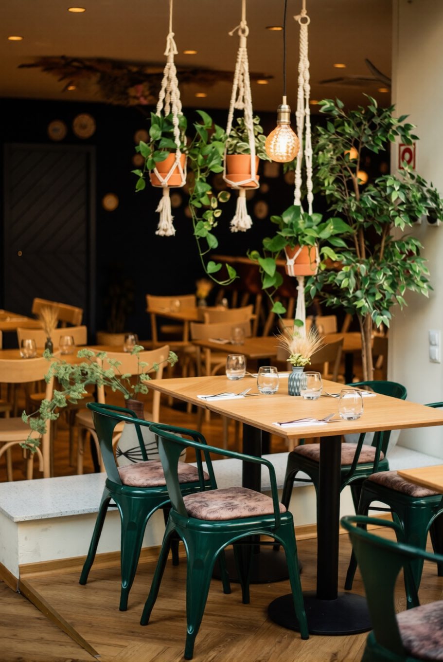 - Hängende Pflanzen und Makramee-Elemente, die die Strenge des Raumes auflockern