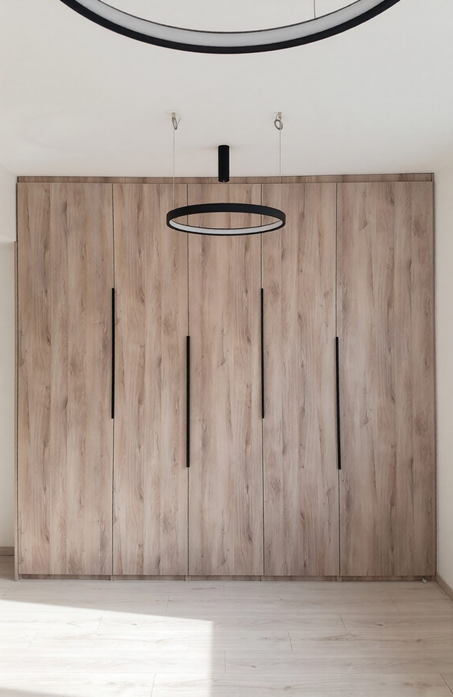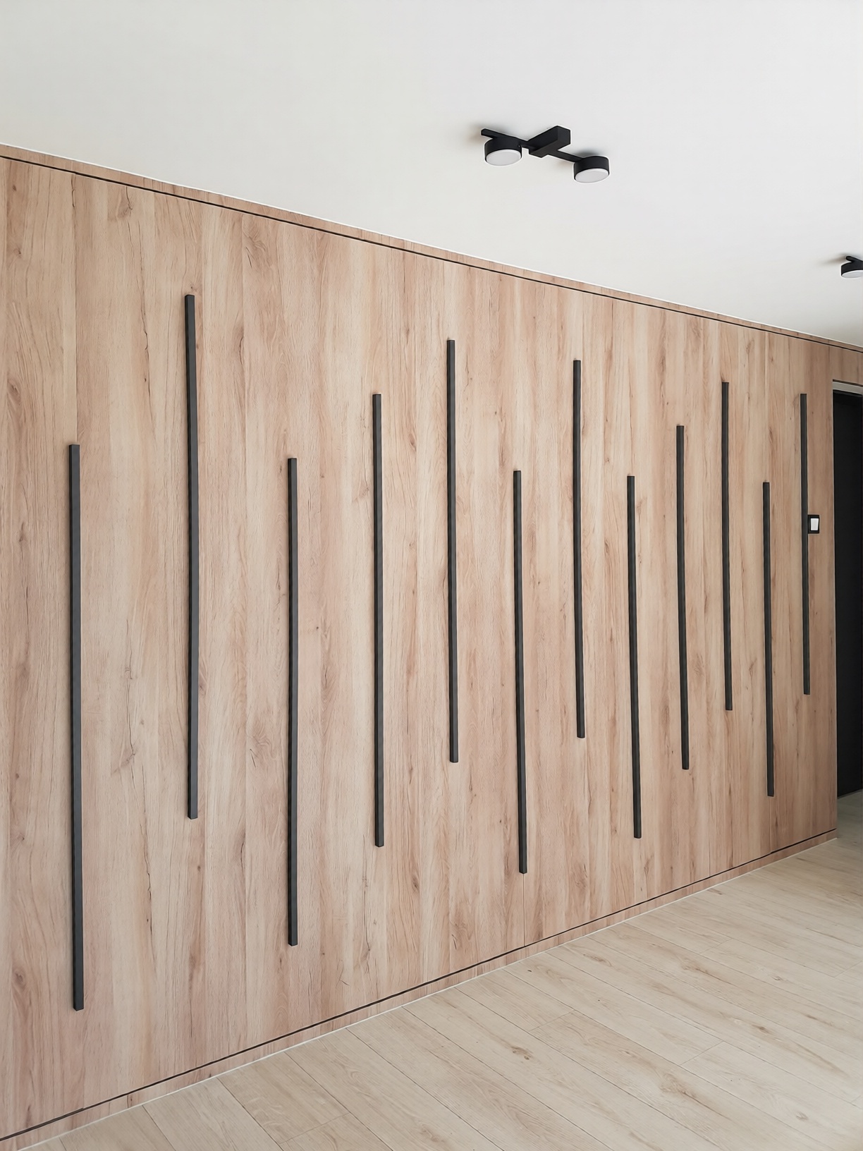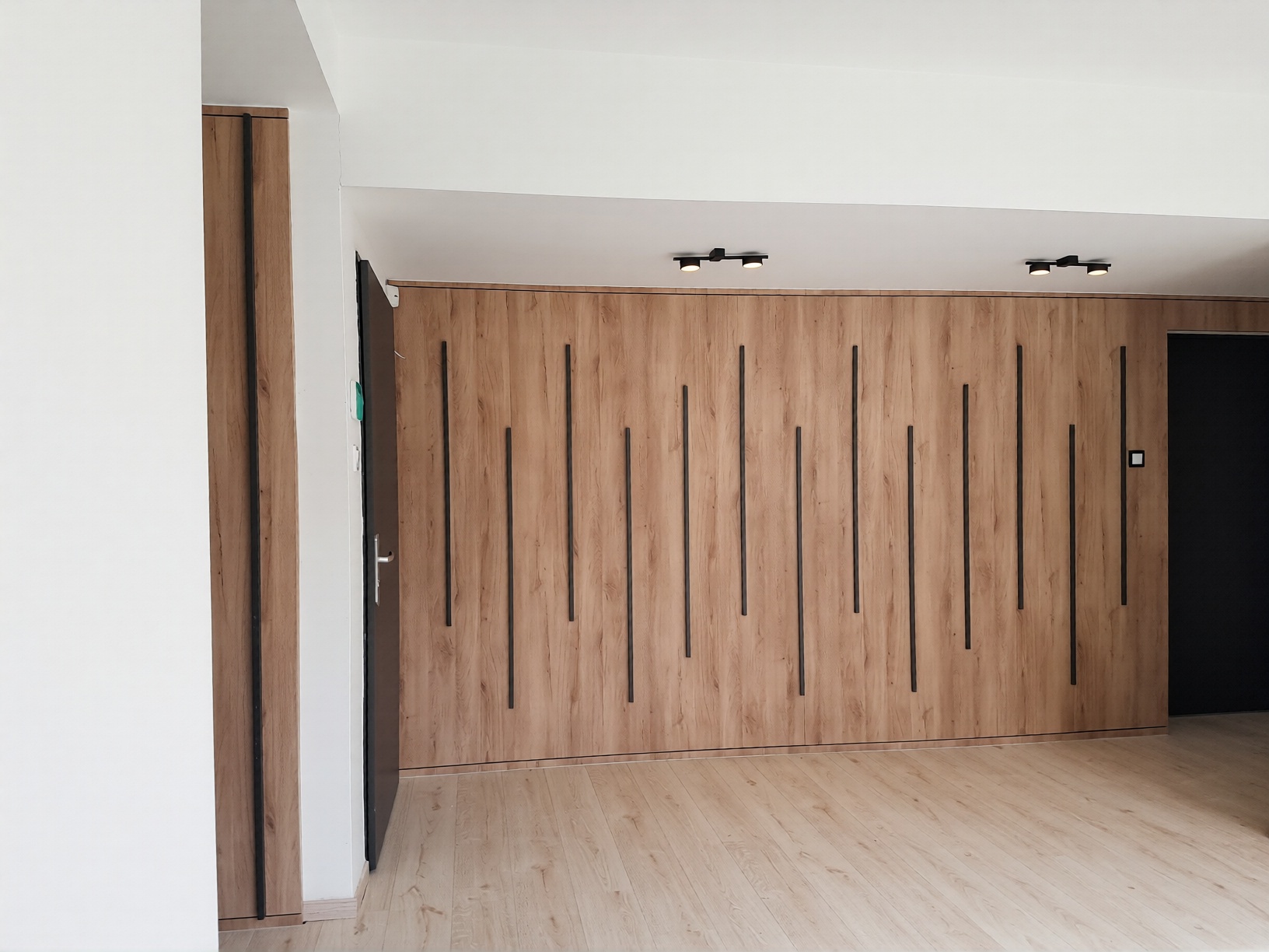 Runde Leuchten bilden einen bewussten Kontrast zur linearen Rhythmik der Wandverkleidungen und schaffen ein ruhiges, ausgewogenes Raumgefühl.