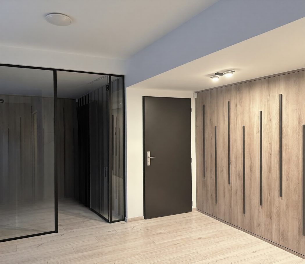 Flure und Verkehrsflächen dienen nicht nur als Übergangszonen, sondern als aktive Elemente der visuellen Identität des Büros. Die entlang der Längswände verlaufenden Holzverkleidungen führen den Raum optisch und schaffen zugleich eine warme, menschliche Atmosphäre.