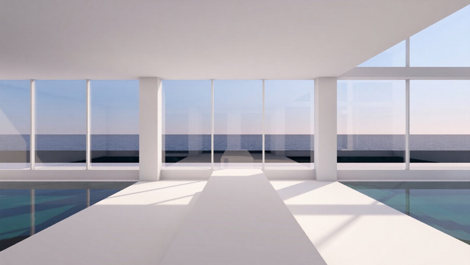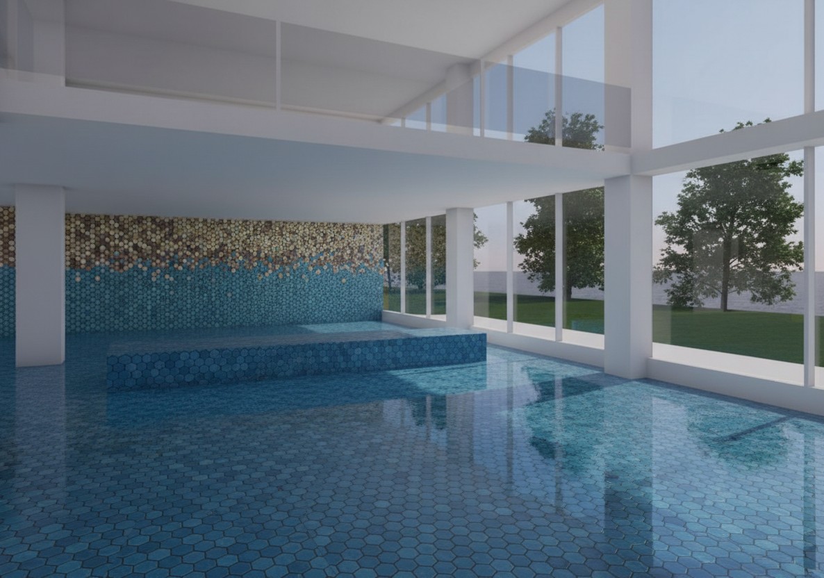 - Aquamarinblaue Wandbeläge: Spiegeln die Farbe des Wassers wider, mit verschiedenen Schattierungen für Dynamik und visuellen Rhythmus.