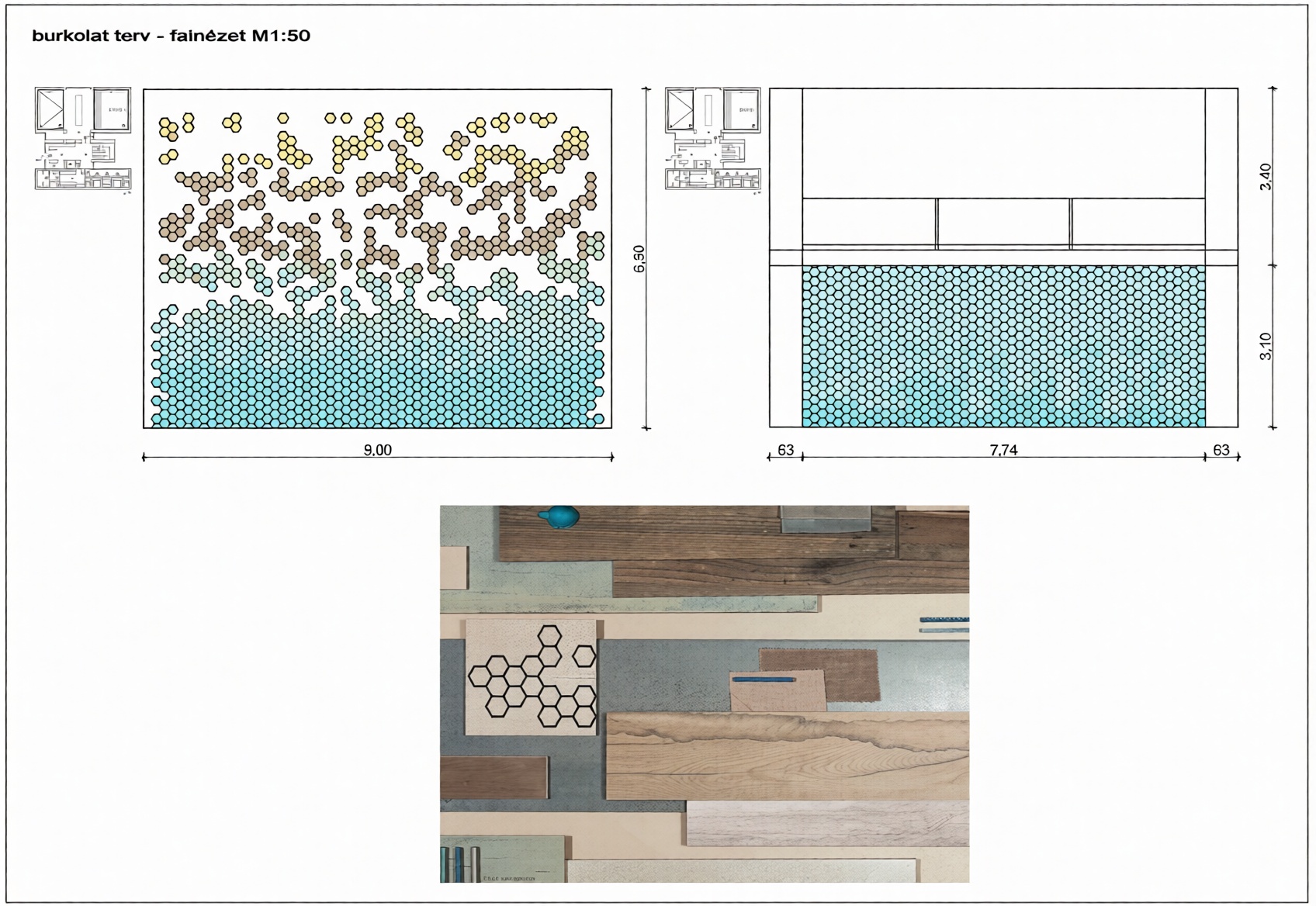 - Wabenförmige Fliesen: Von Blau über Beige- und Brauntöne bis hin zu hellgelben Elementen, um Wasser, Sand und Sonnenschein zu repräsentieren.